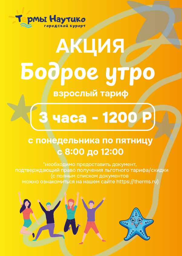 Скидка не распространяется на дополнительные услуги, абонементы, подарочные карты и действует только при оплате входа в Термы, не действует при оплате тарифа «превышение времени нахождения в Термах» на выходе из Терм.